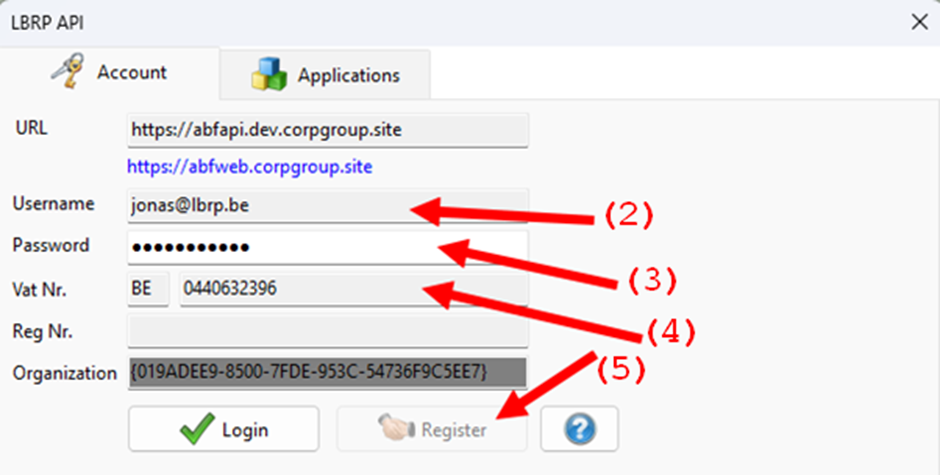 - BTW nummer → hiermee wordt uw “organisatie” aangemaakt. Dit kan al vooraf ingevuld zijn. (4)