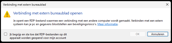 Zet een vinkje bij "Ik begrijp en sta toe dat RDP-bestanden op dit apparaat worden geopend voor mijn account" en klik daarna op OK.