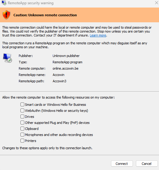 U zal de volgende melding krijgen bij het connecteren met AccoWin Online: